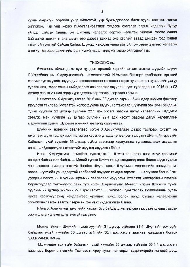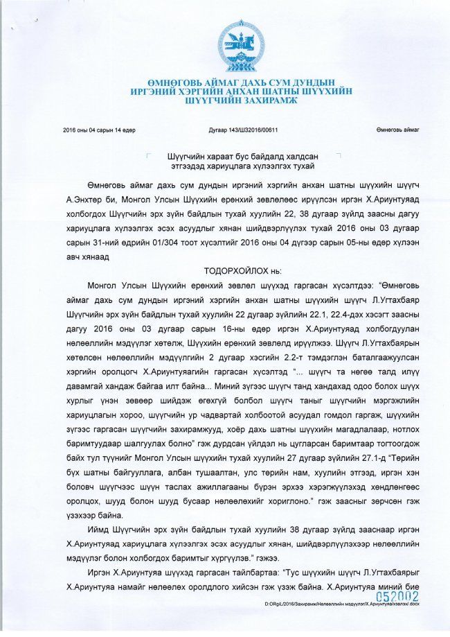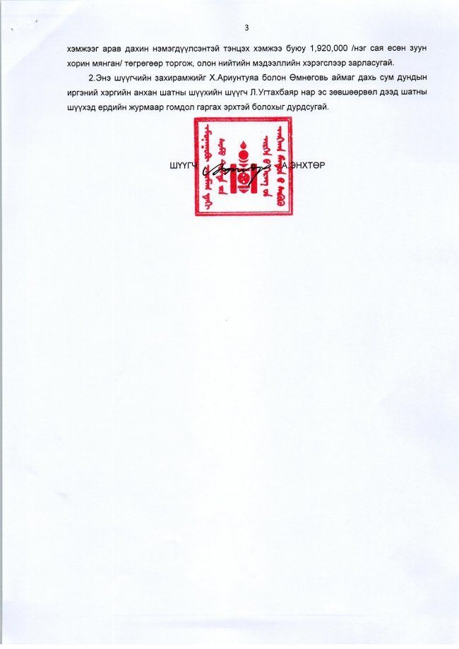 Өмнөговь аймаг дахь сум дундын Иргэний хэргийн анхан шатны шүүхийн шүүгч Л.Угтахбаяр хэргийн оролцогч Х.Ариунтуяад холбогдуулан хөтөлсөн нөлөөллийн мэдүүлгийн дагуу Шүүхийн ерөнхий зөвлөл Шүүгчийн эрх зүйн байдлын тухай хуулийн 22, 38 дугаар зүйлд зааснаар хариуцлага хүлээлгэх асуудлыг шийдвэрлүүлэхээр Өмнөговь аймаг дахь сум дундын Иргэний хэргийн анхан шатны шүүхэд шилжүүлснээр тус шүүхээс хянан хэлэлцээд Х.Ариунтуяаг шүүгчийн хараат бус байдалд нөлөөлсөн гэж үзэж хөдөлмөрийн хөлсний доод хэмжээг 10 нэмэгдүүлсэнтэй тэнцэх хэмжээний буюу 1 920 000 төгрөгөөр торгох шийтгэл ногдуулжээ.