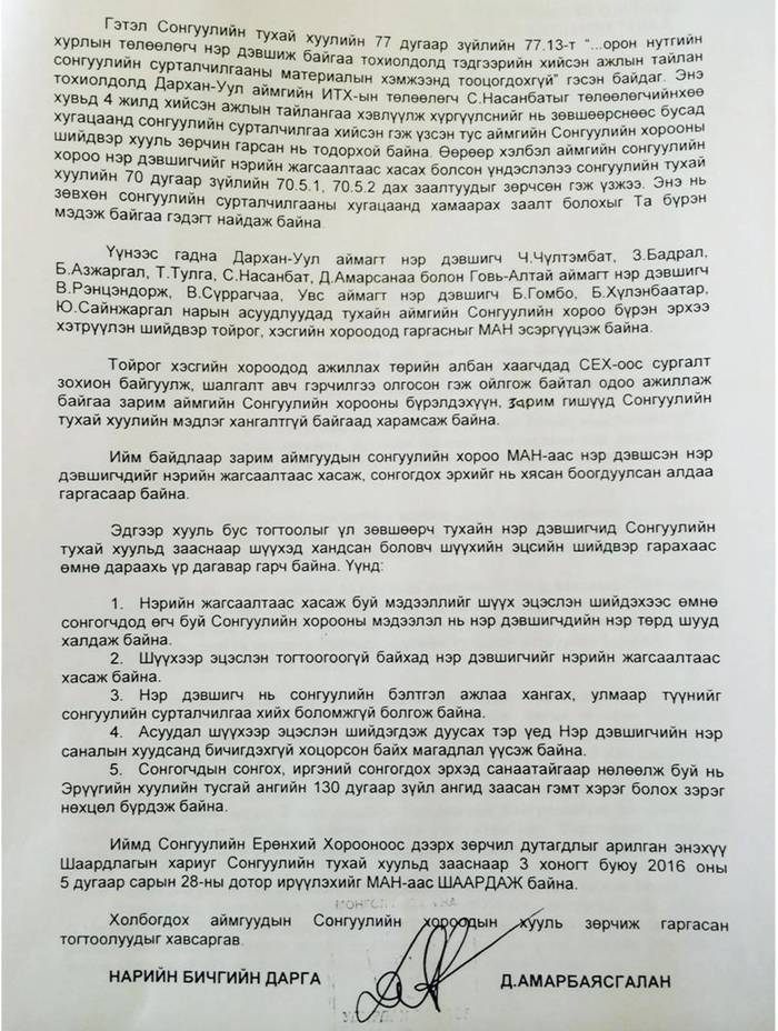 Ингэхдээ Дархан-Уул аймгийн ИТХ-ын төлөөлөгчөөр 2012-2016 оны хооронд ажилласан С.Насанбатыг тайлан сэтгүүлээ тараасных нь төлөө хууль зөрчсөн хэмээн үзжээ. Гэтэл Сонгуулийн тухай хуулийн 77 дугаар зүйлд "....орон нутгийн хурлын төлөөлөгч нэр дэвшиж байгаа тохиолдолд тэдгээрийн хийсэн ажлын тайлан сонгуулийн сурталчилгааны материалын хэмжээнд тооцохгүй" гэсэн байдаг.