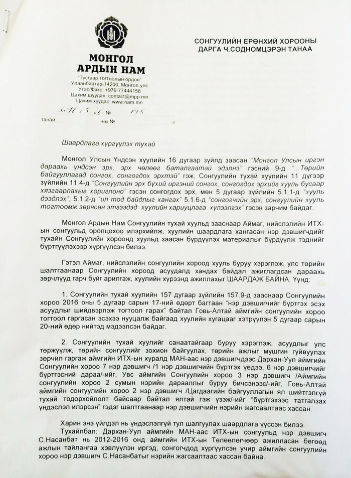 Түүнчлэн Сонгуулийн тухай хуулийг мушгин гуйвуулж, асуудалд улс төрийн өнгө аясаар хандаж, Дархан-Уул аймгийн ИТХ-д МАН-ын долоон нэр дэвшигч, Увс аймгийн МАН-ын гурван нэр дэвшигчийг бүртгэхээс татгалзсан байна.